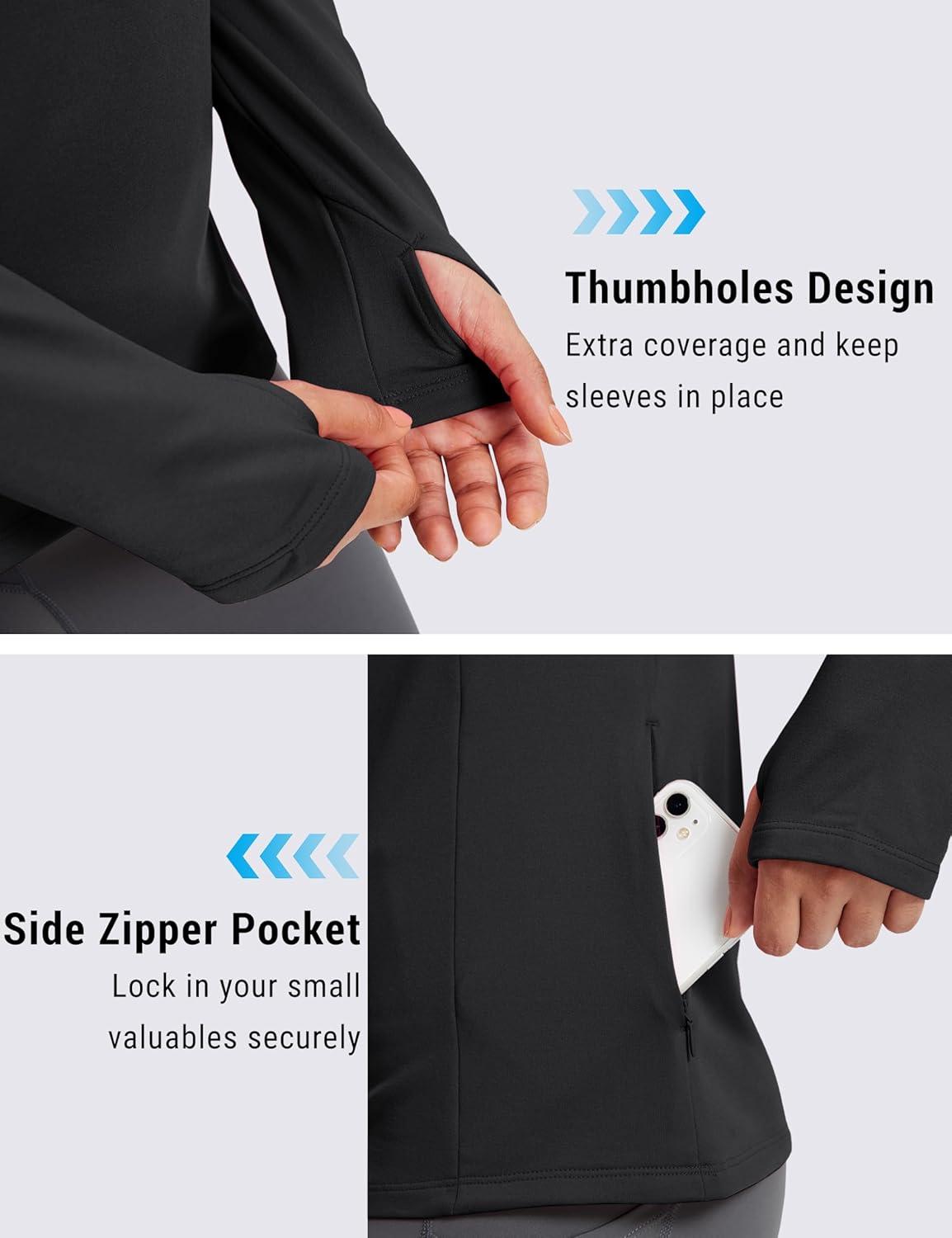 Our Women's Thermal Long Sleeve Shirts are your go-to for cold weather—perfect for running, hiking, or daily layering! As premium fleeced lined workout shirts, they offer lightweight warmth with a slim, non-bulky fit, letting you move freely. Soft fleece locks in heat for chilly runs/outdoor workouts, while 4-way stretch fabric ensures no tightness, just all-day comfort. Side zippered pockets safely hold your phone, cards, or keys. Thumb holes warm wrists, keep cuffs in place, and block cold air. Whether trail-running on frosty mornings, layering under jackets, or gym sessions, these fleeced lined workout shirts blend function and style. Upgrade cold-weather activewear with this fleeced undershirt—warm, flexible, ideal for running, cold weather!