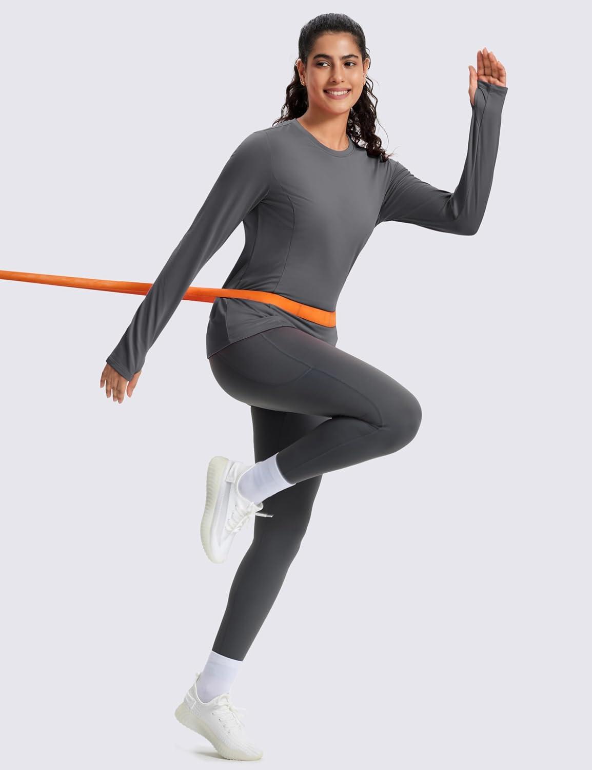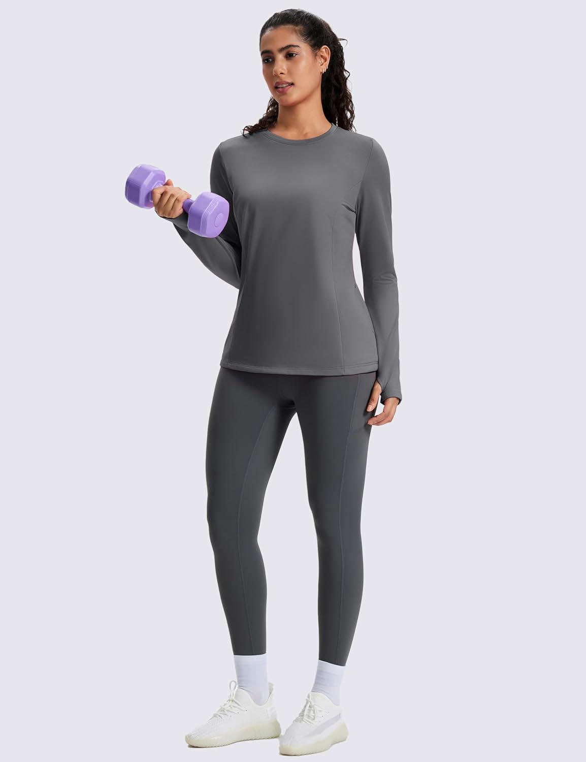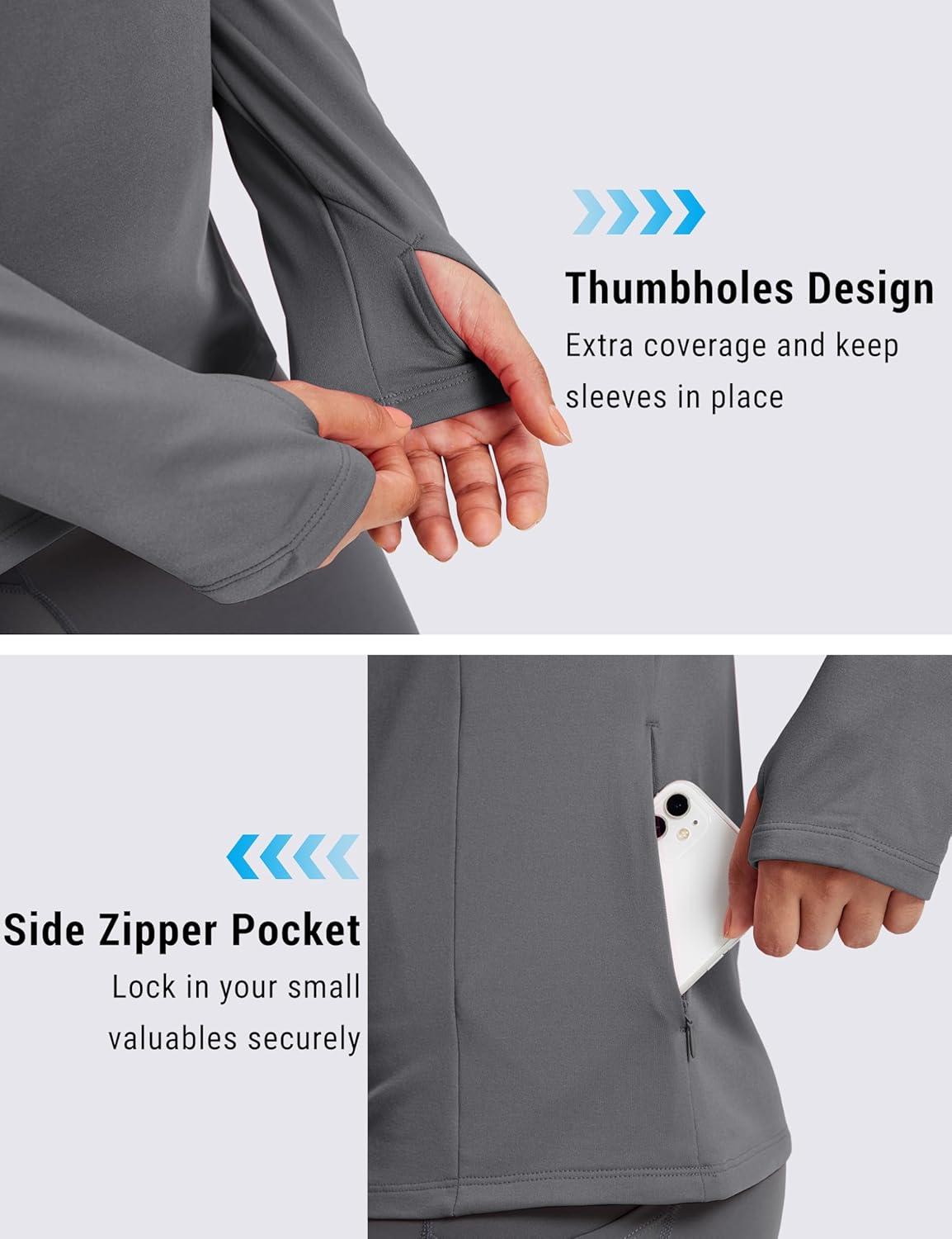 Our Women's Thermal Long Sleeve Shirts are your go-to for cold weather—perfect for running, hiking, or daily layering! As premium fleeced lined workout shirts, they offer lightweight warmth with a slim, non-bulky fit, letting you move freely. Soft fleece locks in heat for chilly runs/outdoor workouts, while 4-way stretch fabric ensures no tightness, just all-day comfort. Side zippered pockets safely hold your phone, cards, or keys. Thumb holes warm wrists, keep cuffs in place, and block cold air. Whether trail-running on frosty mornings, layering under jackets, or gym sessions, these fleeced lined workout shirts blend function and style. Upgrade cold-weather activewear with this fleeced undershirt—warm, flexible, ideal for running, cold weather!