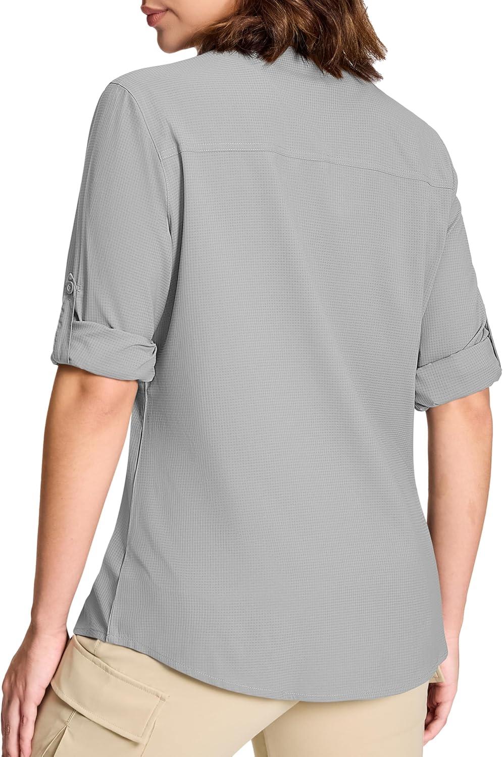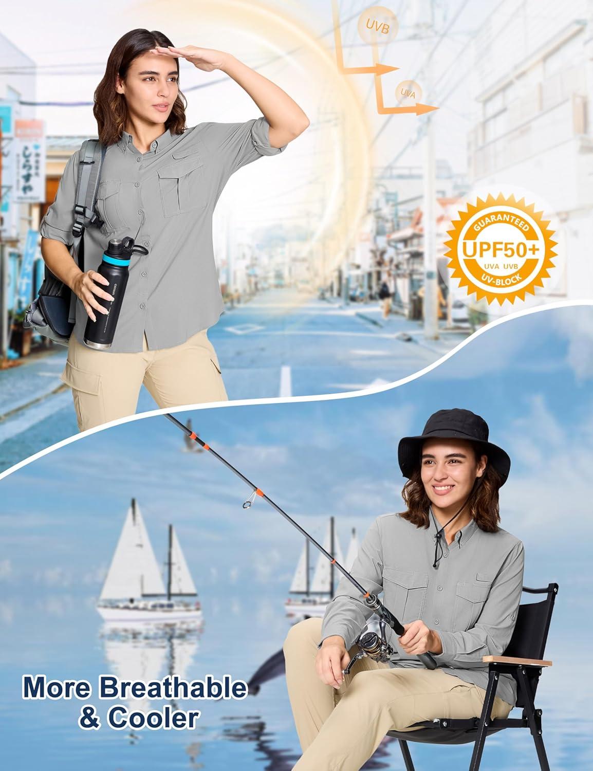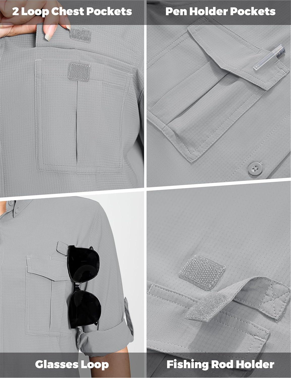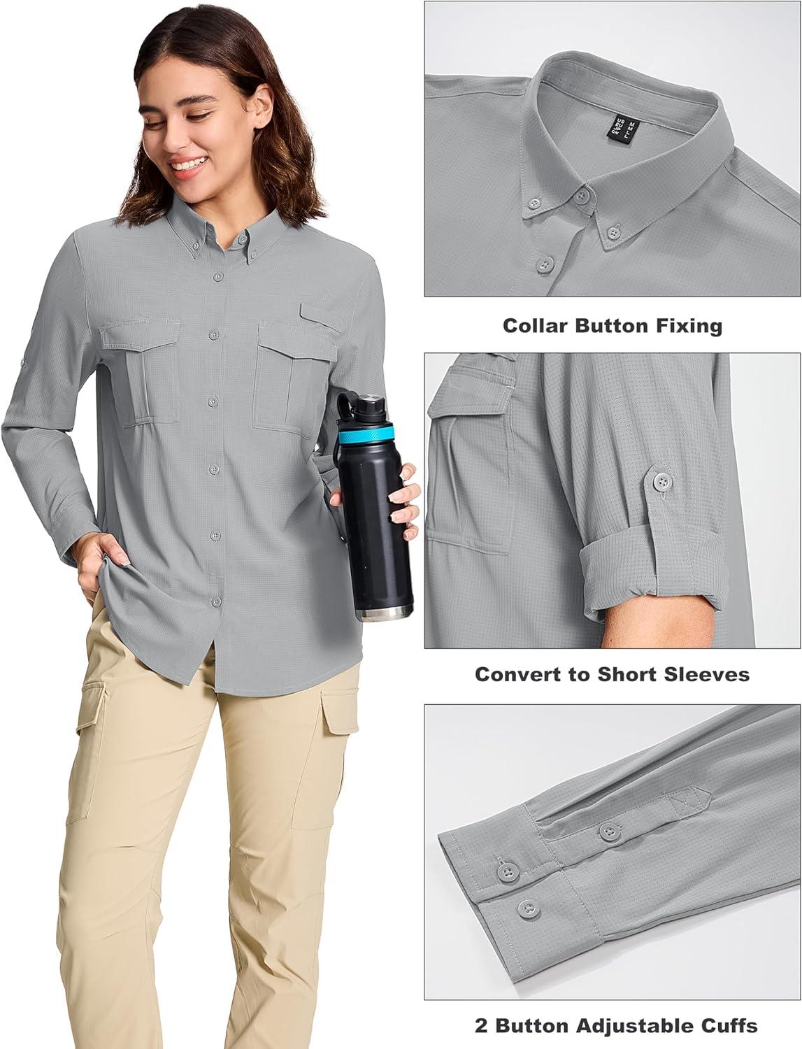 MAGCOMSEN Women’s UPF 50+ Long Sleeve Fishing Shirts UV Sun Protection Quick Dry Button Down Safari Hiking Travel Shirts(Lightgrey)