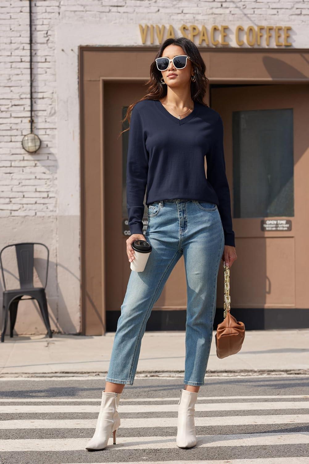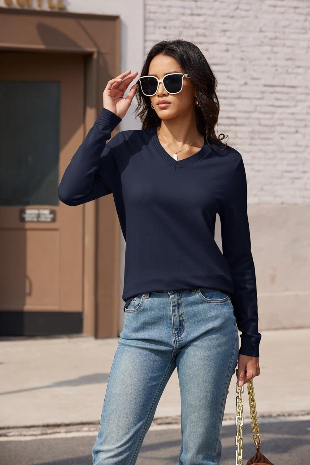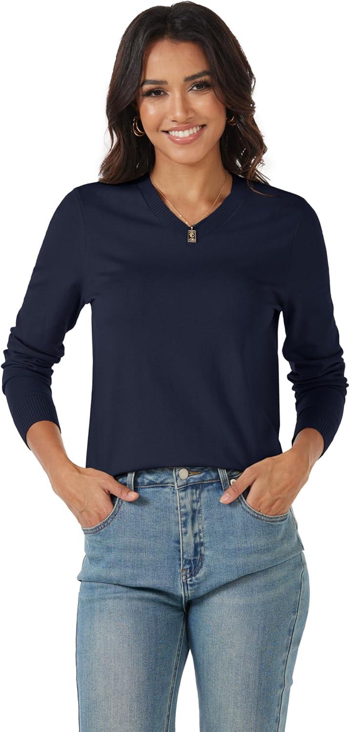 MAGCOMSEN Women’s V Neck Sweater 2025 Spring Casual Long Sleeve Tops Knit Lightweight Pullover Sweaters Jumper(Navy)