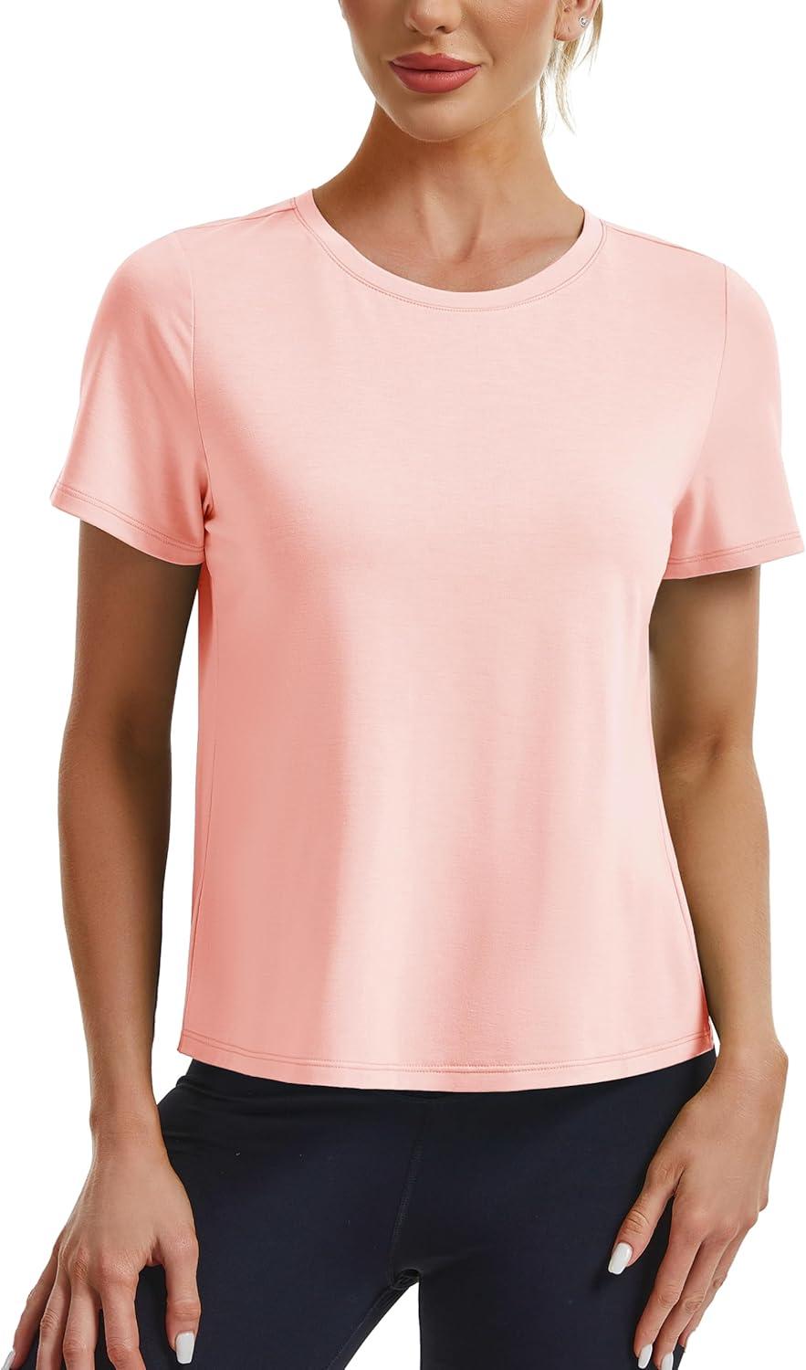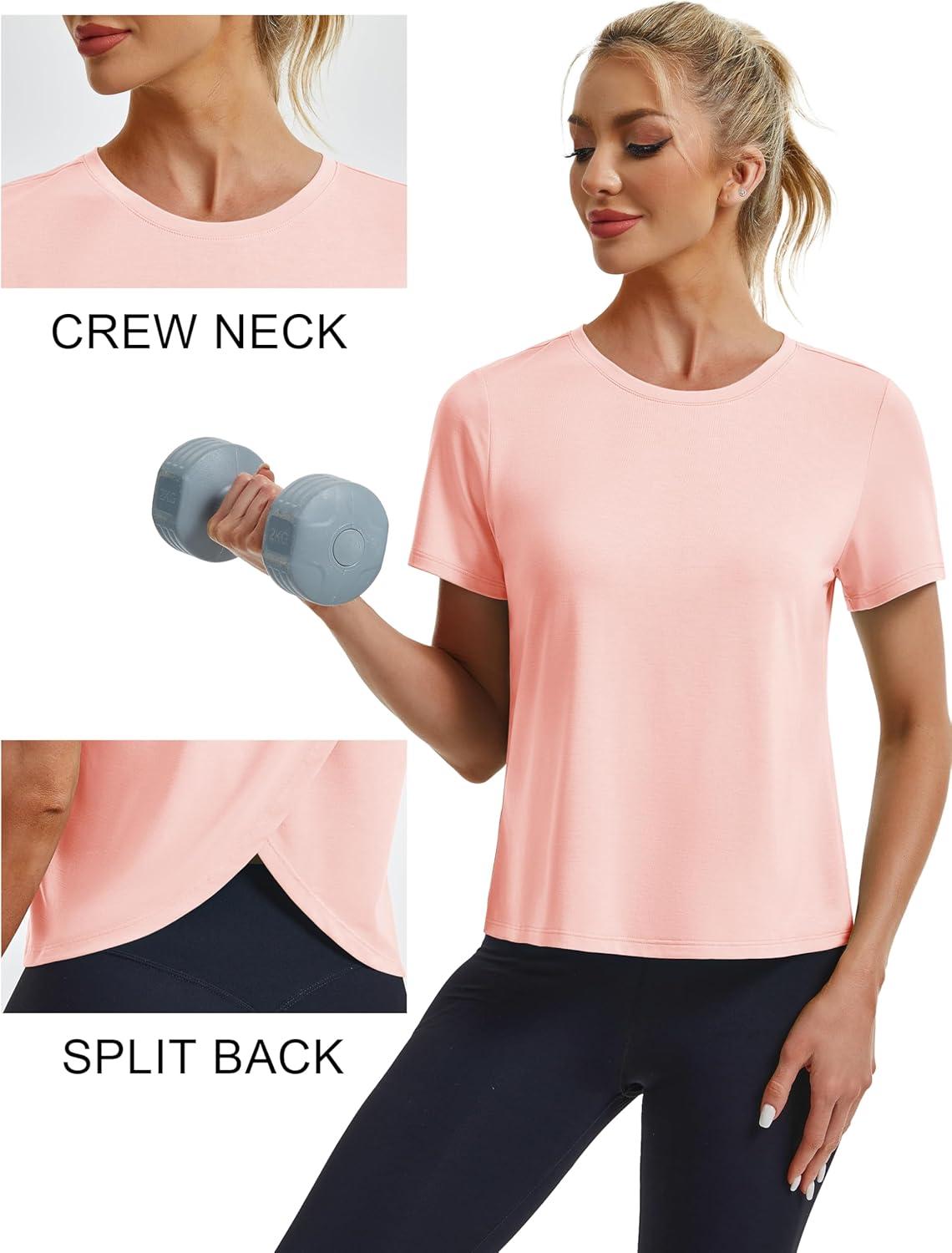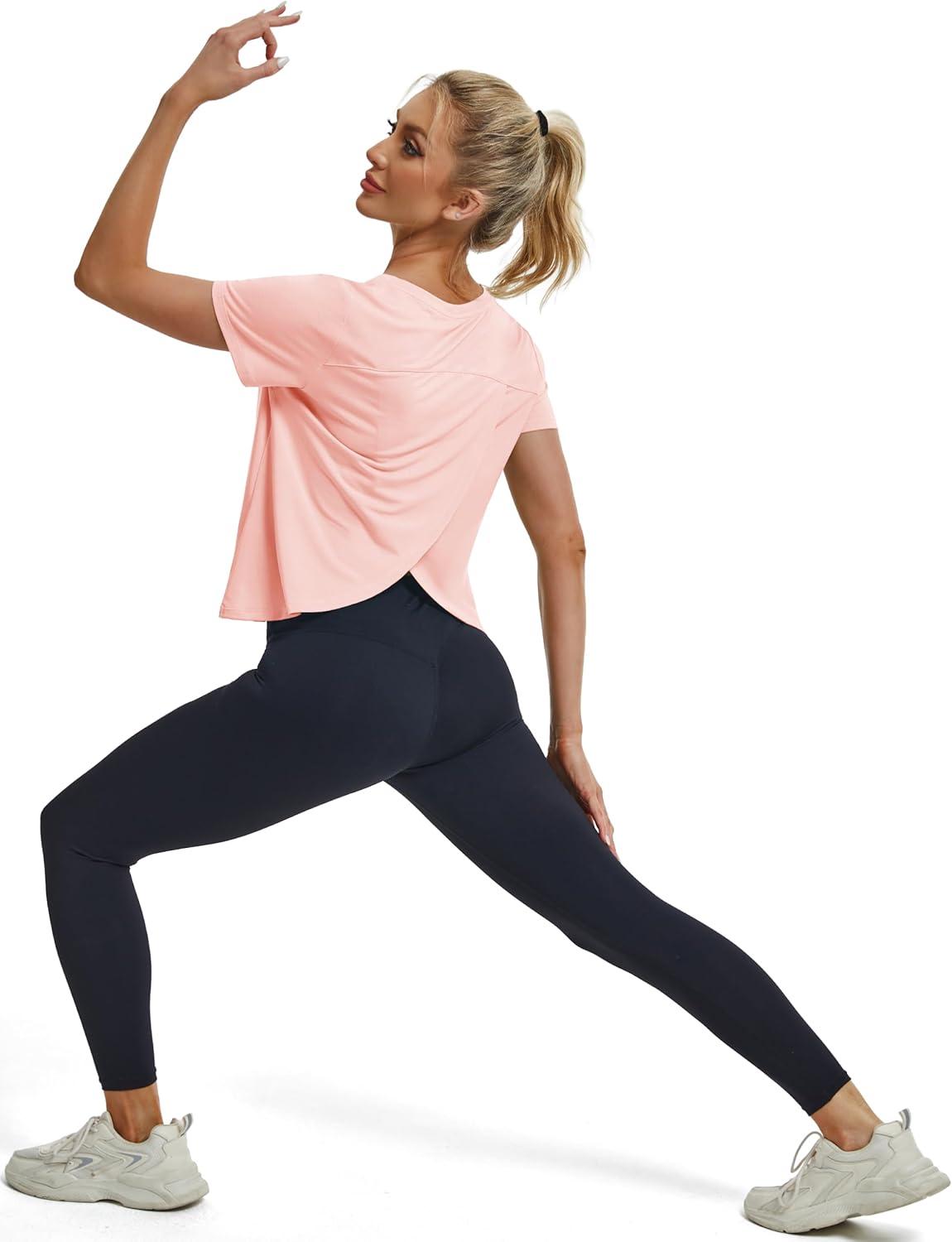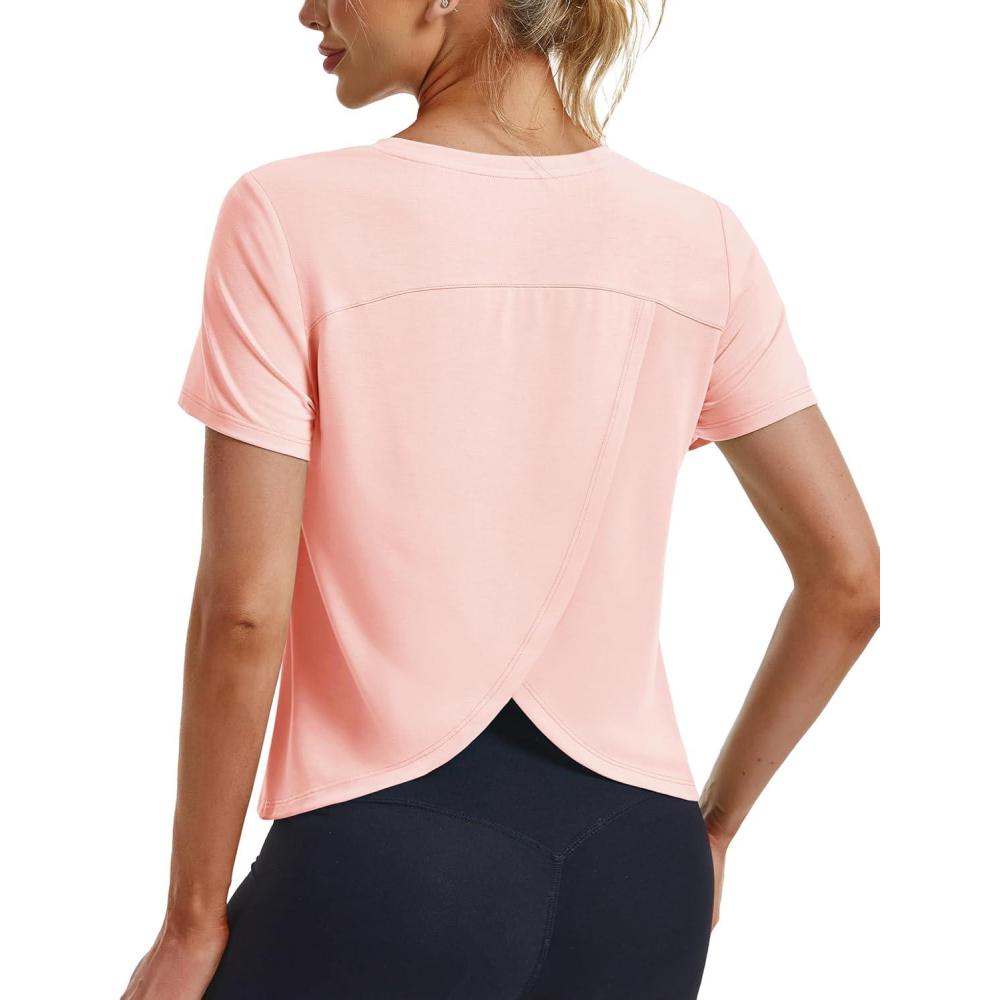MAGCOMSEN Women’s Workout Tops Short Sleeve Athletic Shirts Crop Split Back Tops Gym Running Quick Dry Loose Fit(Light Pink)