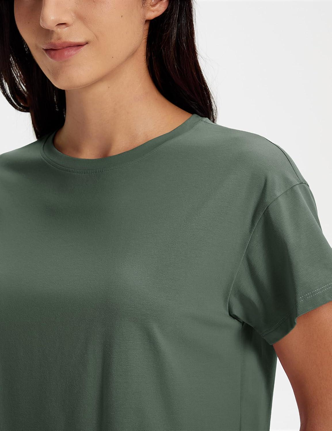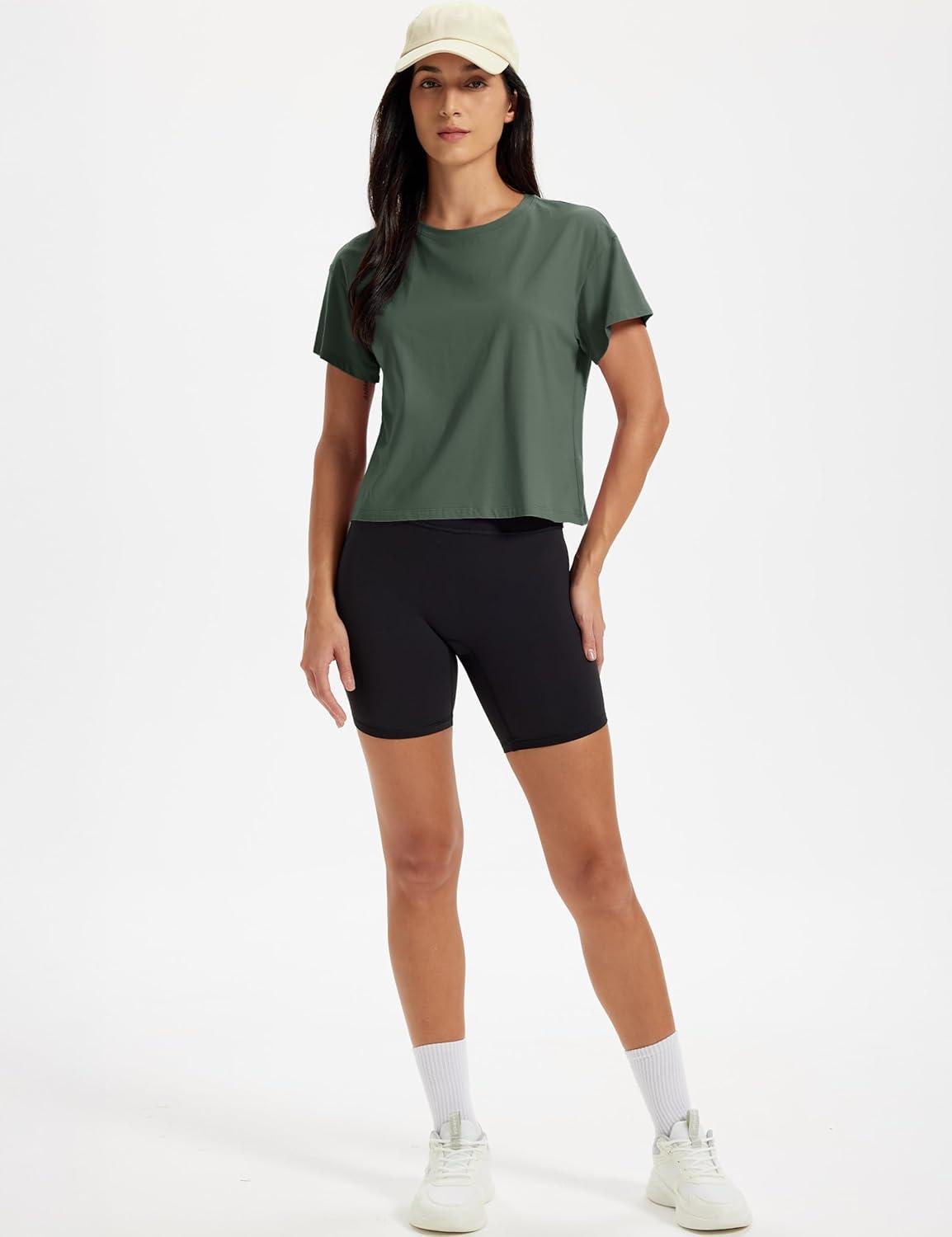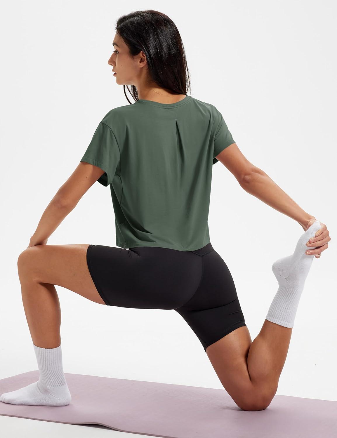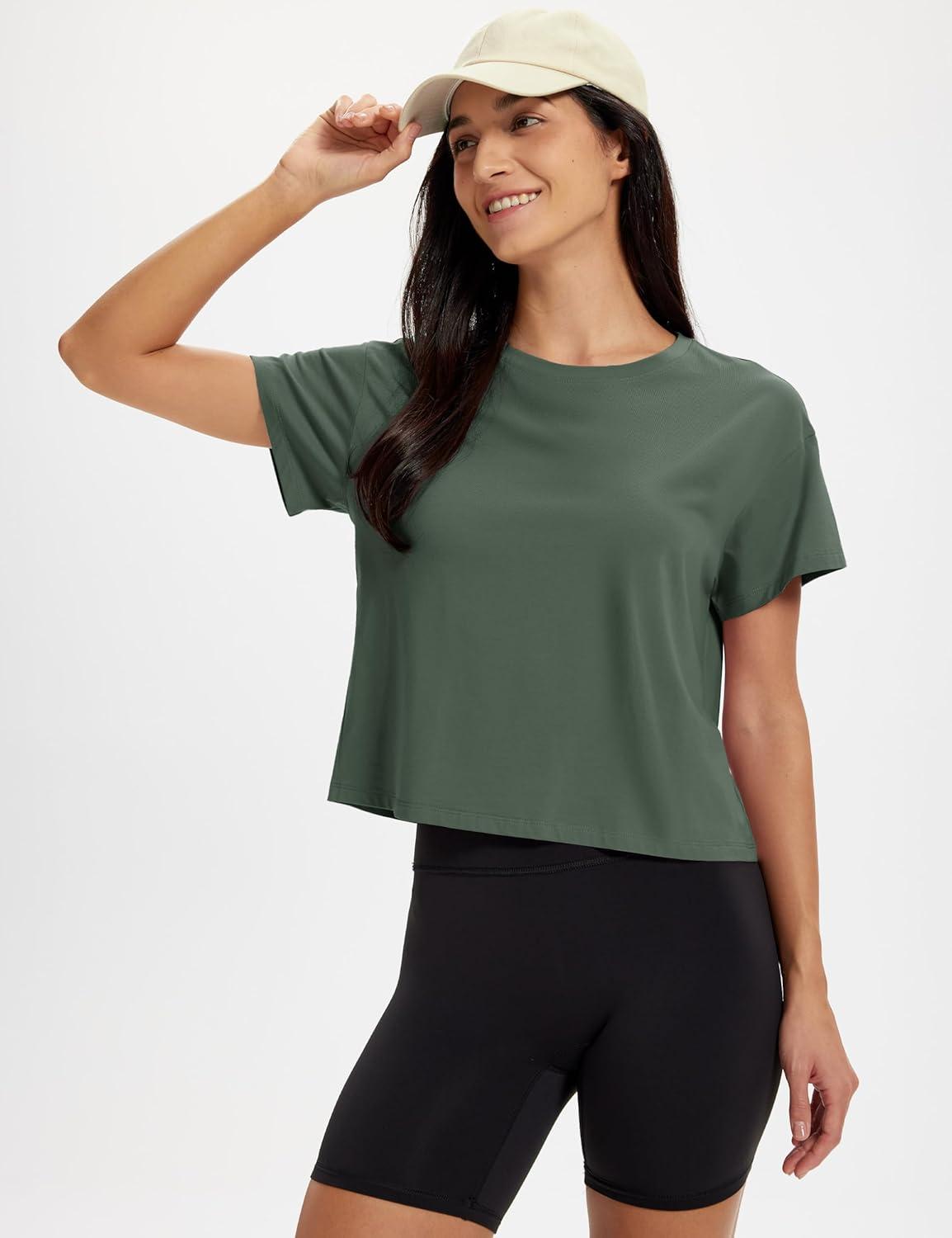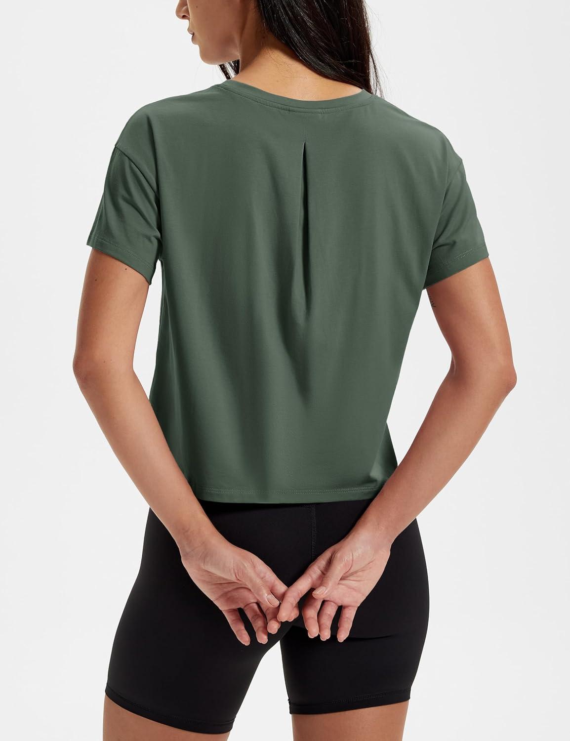 MAGCOMSEN Workout Crop Tops for Women Short Sleeve Cotton Athletic Yoga Tops Loose Casual Cropped T Shirts(Dark Gray Green)