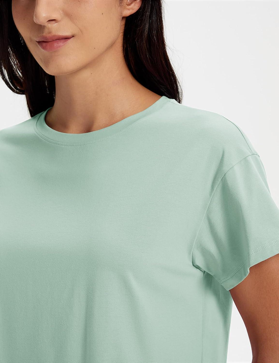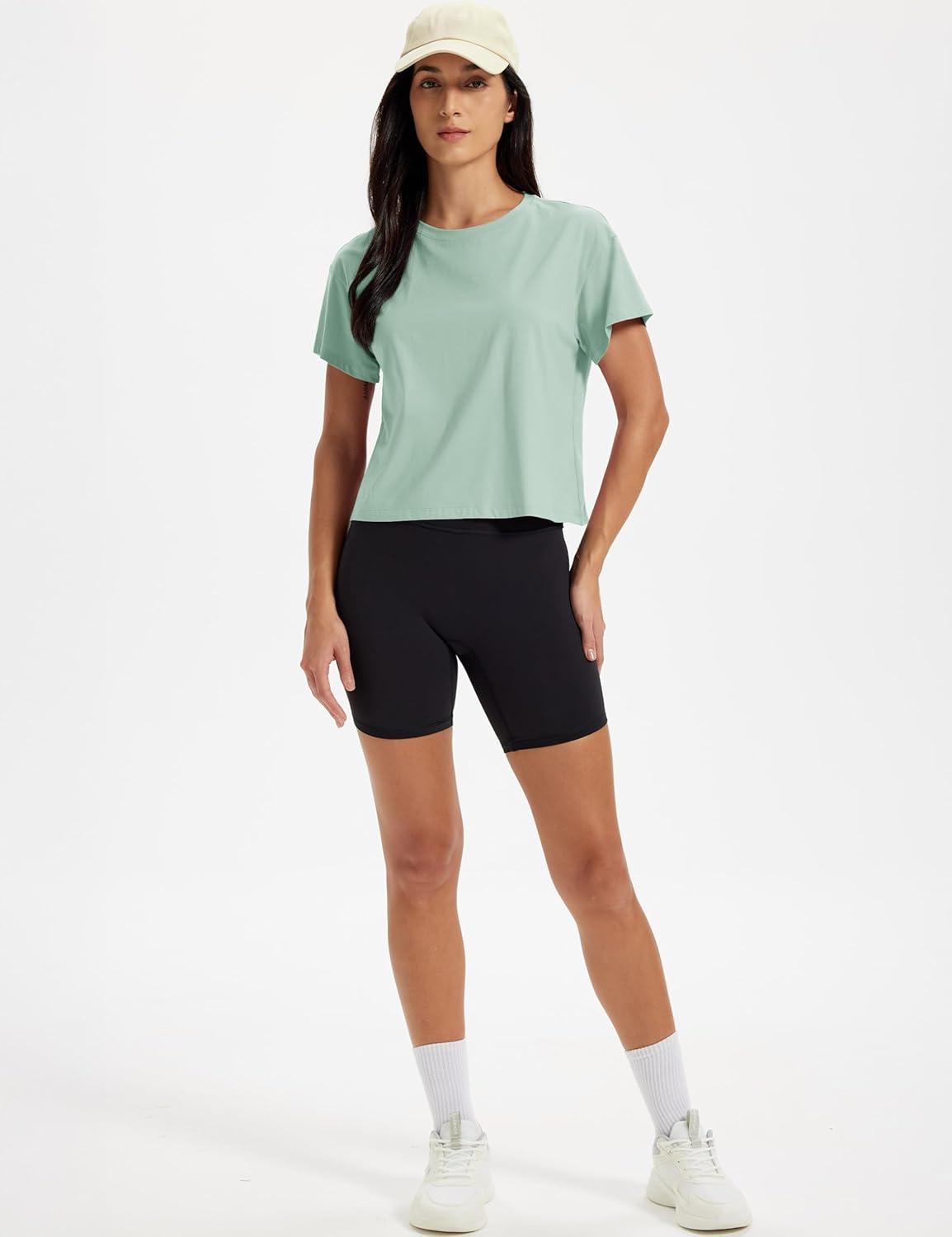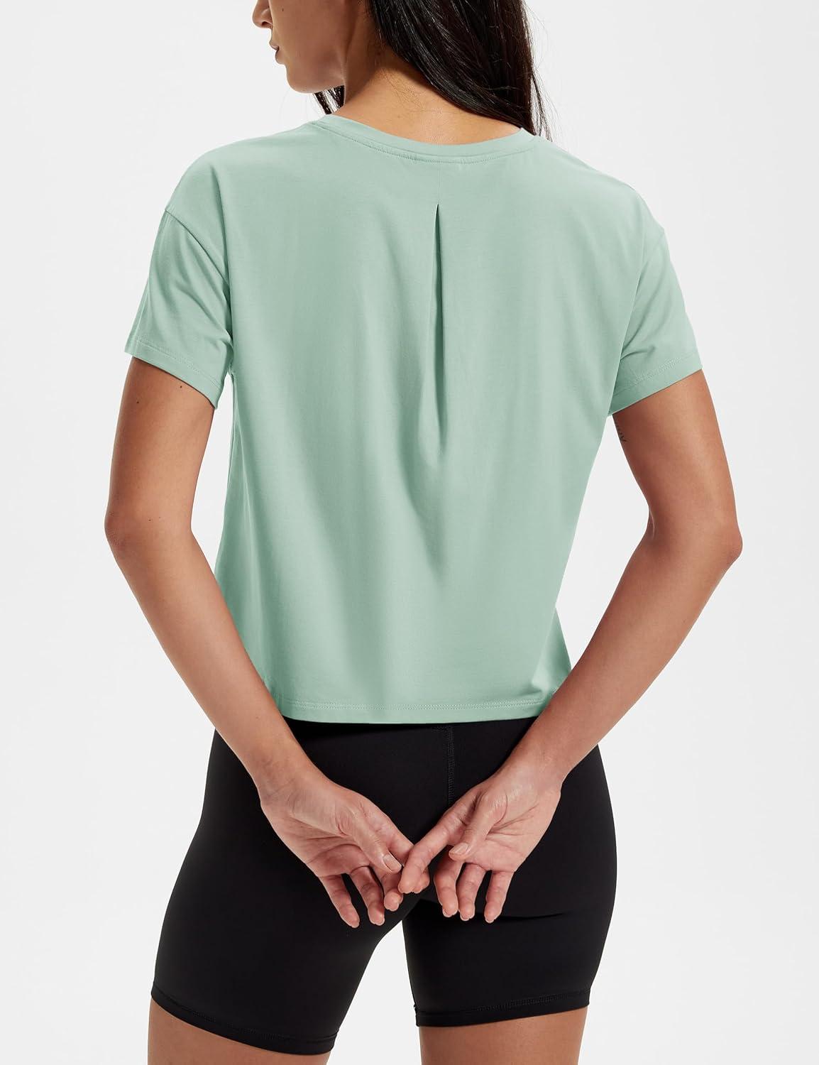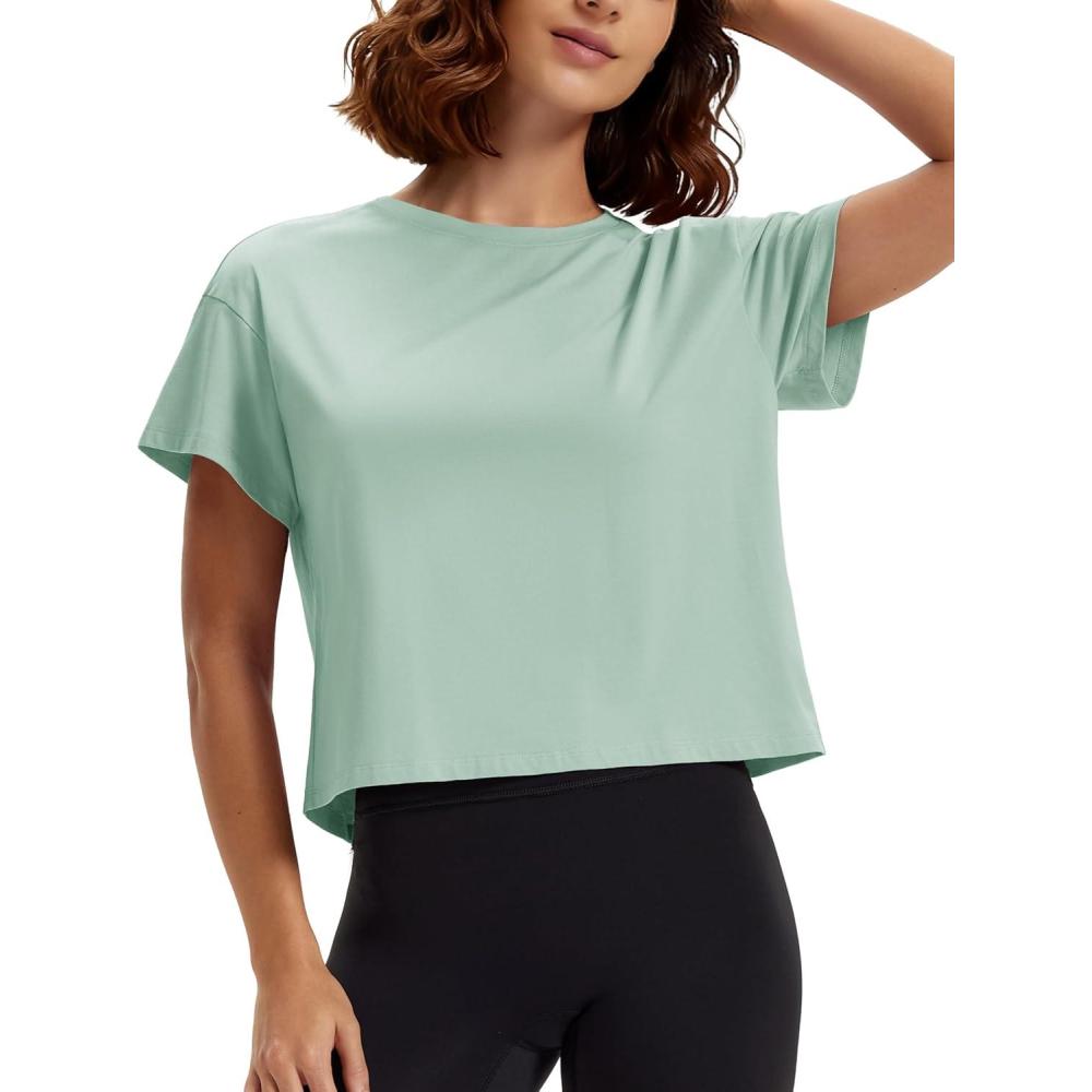 MAGCOMSEN Workout Crop Tops for Women Short Sleeve Cotton Athletic Yoga Tops Loose Casual Cropped T Shirts(Light Gray Green)