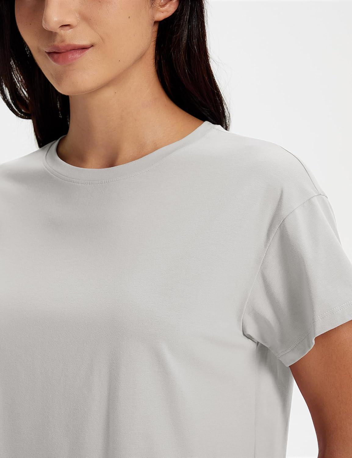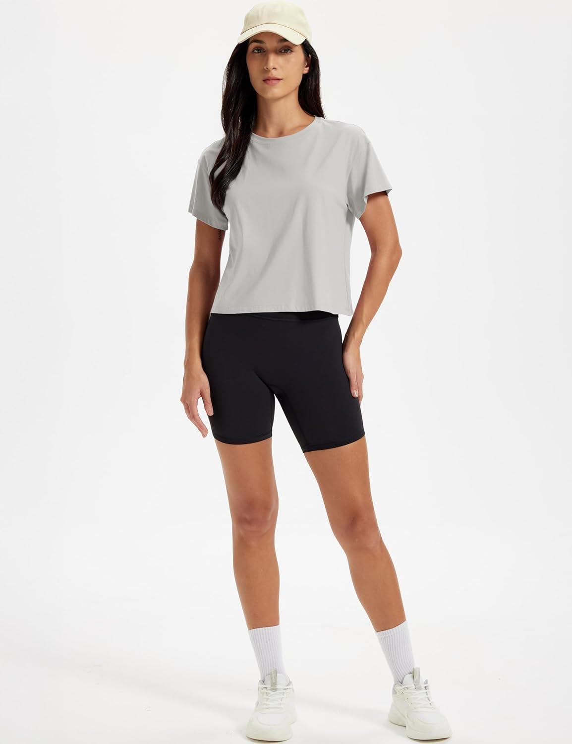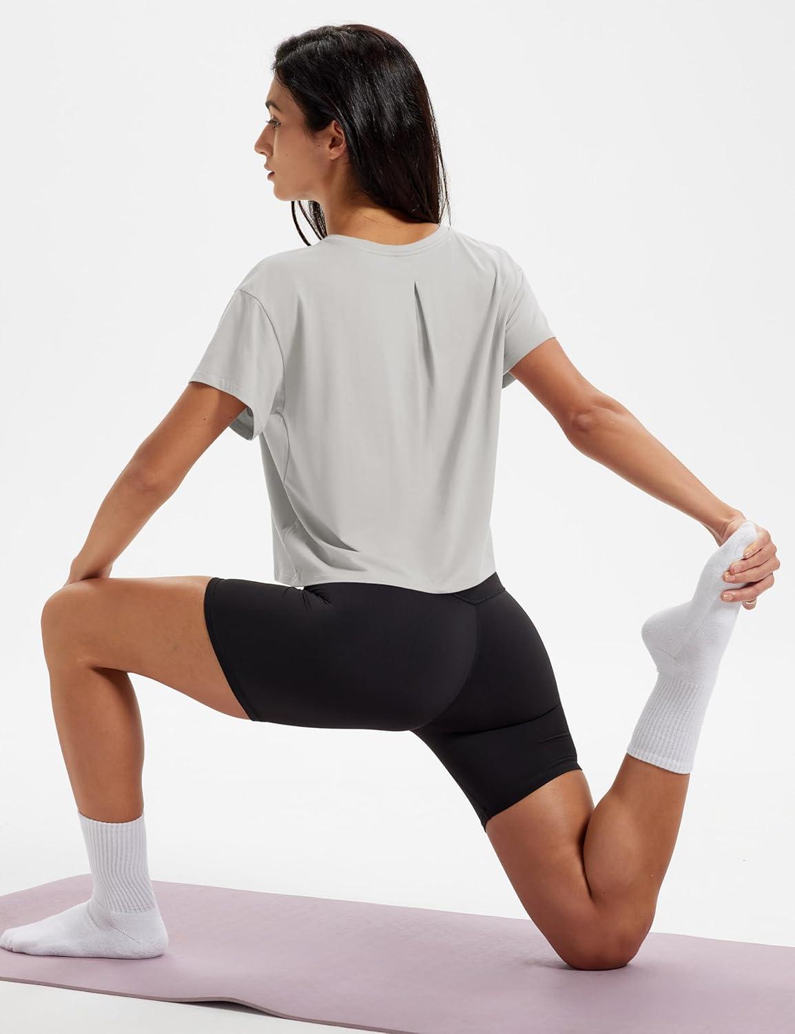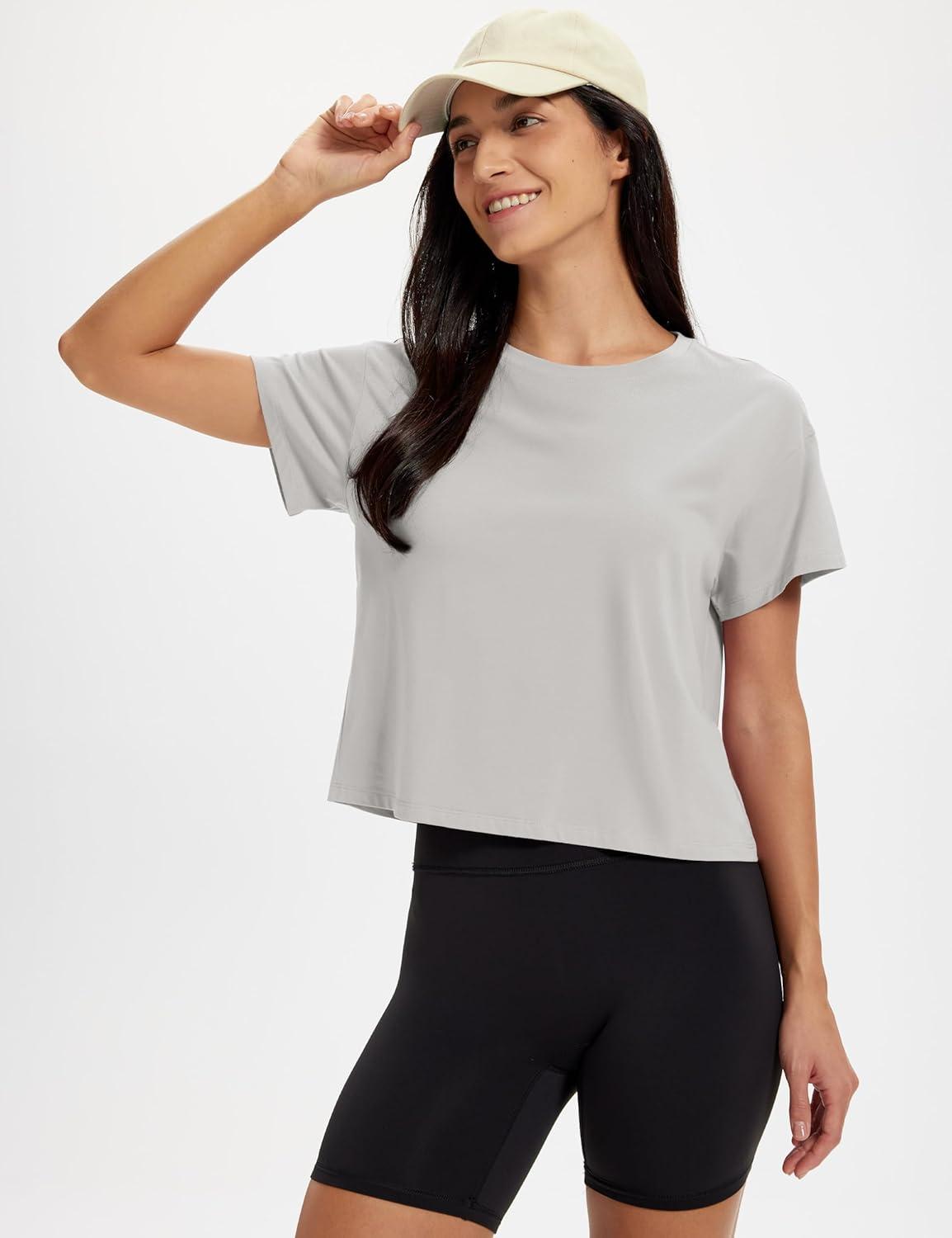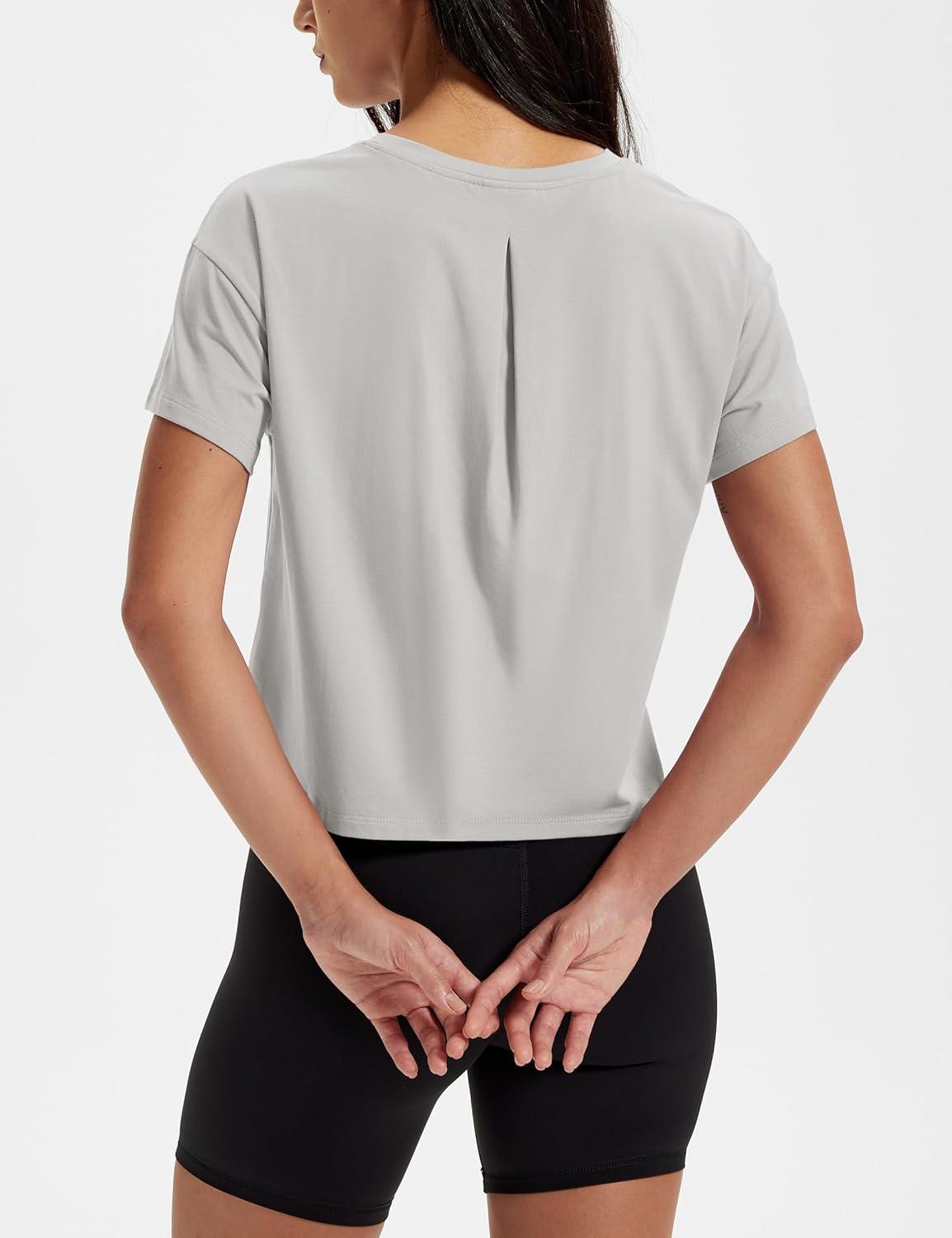 MAGCOMSEN Workout Crop Tops for Women Short Sleeve Cotton Athletic Yoga Tops Loose Casual Cropped T Shirts(Light Grey)