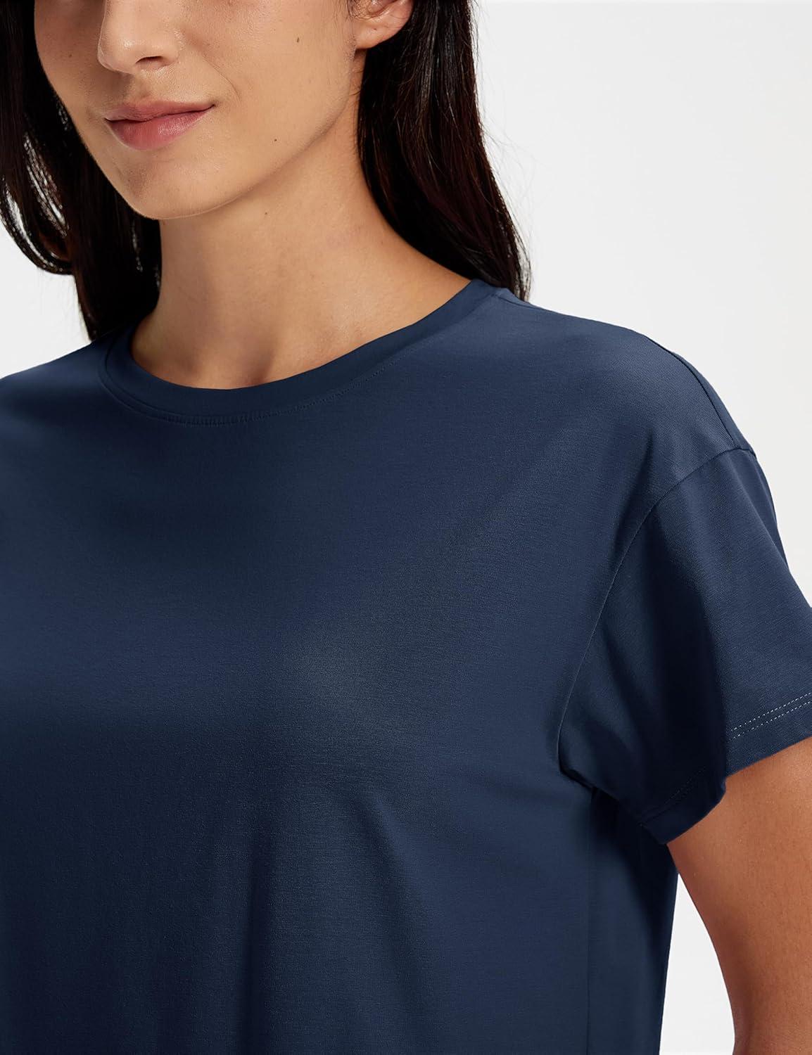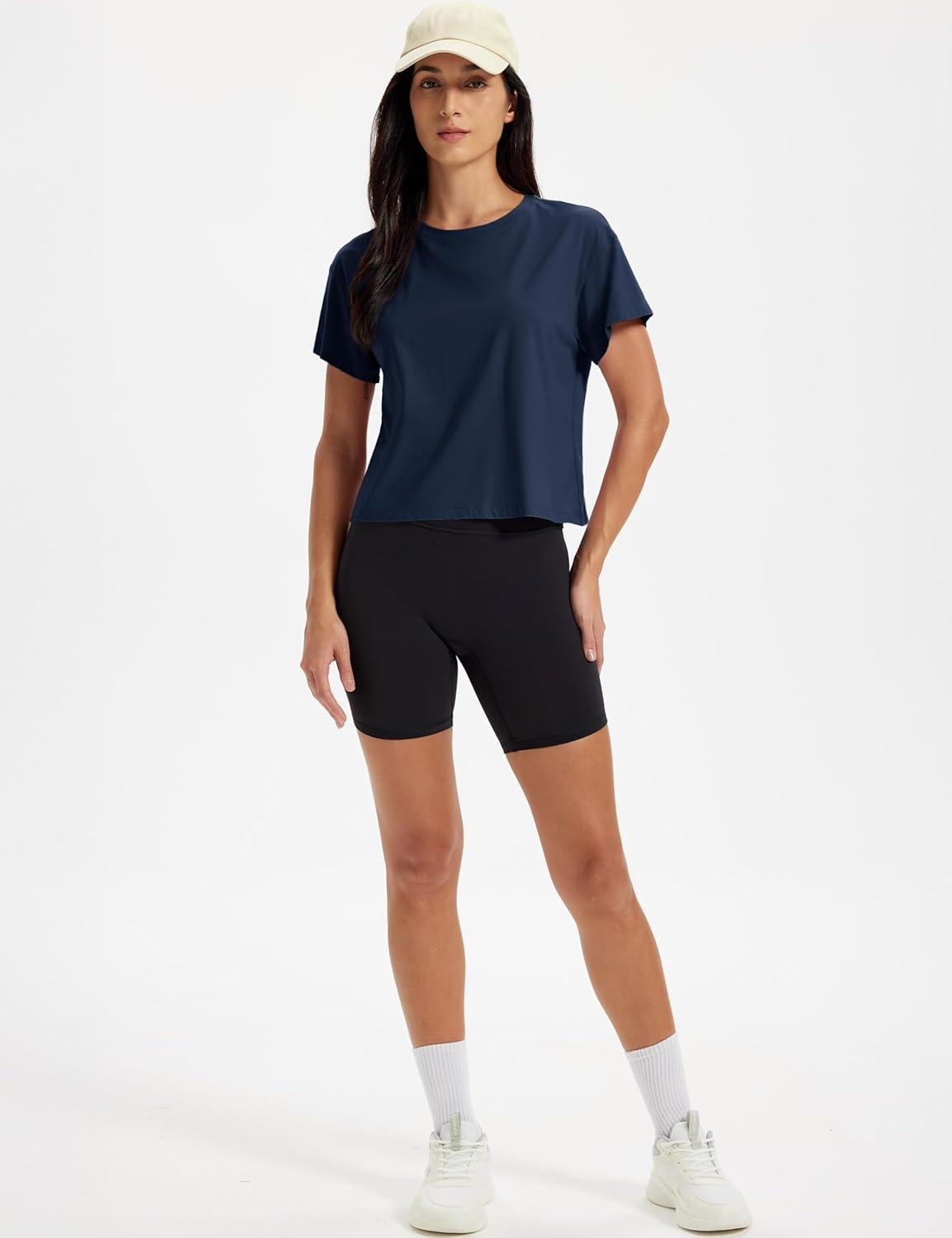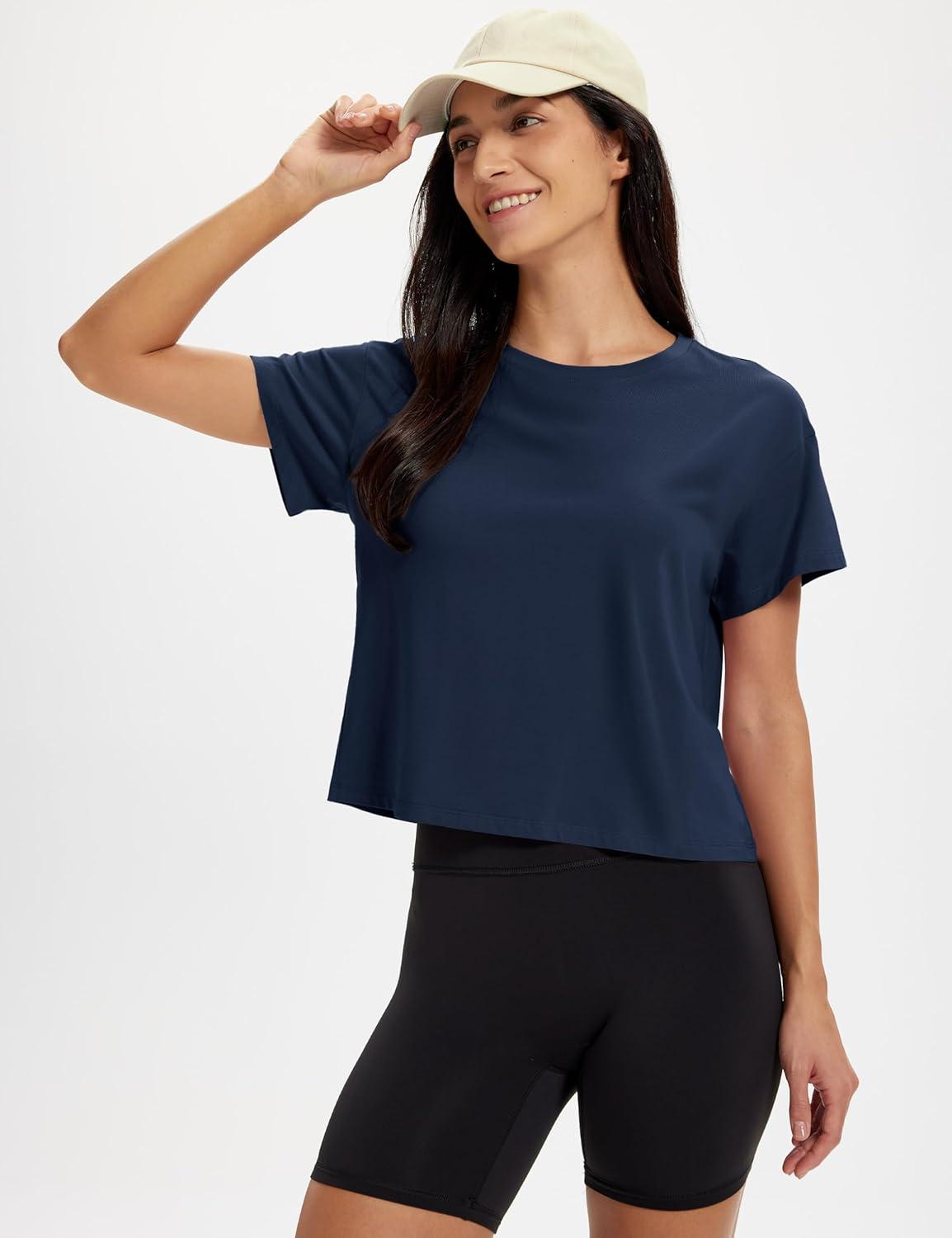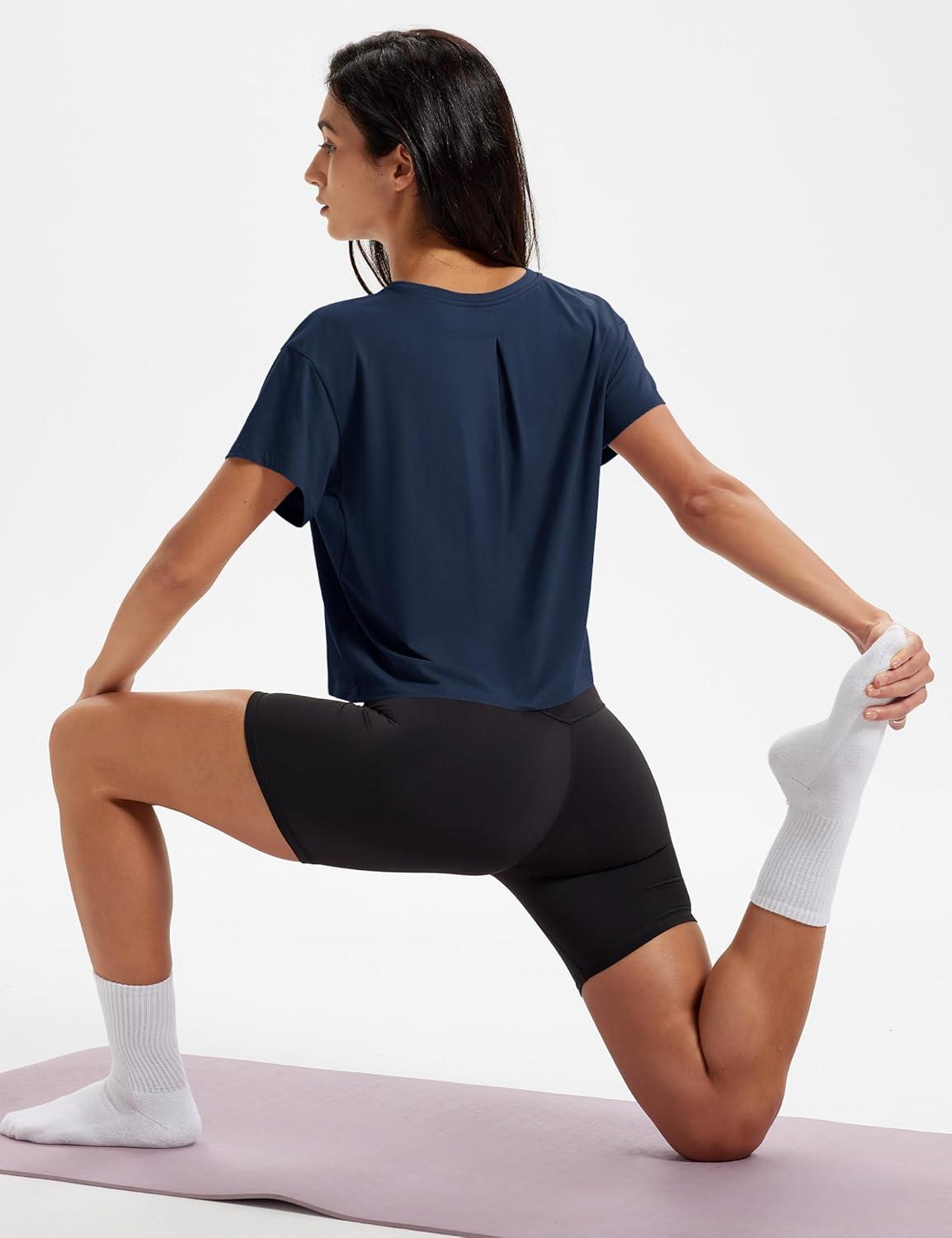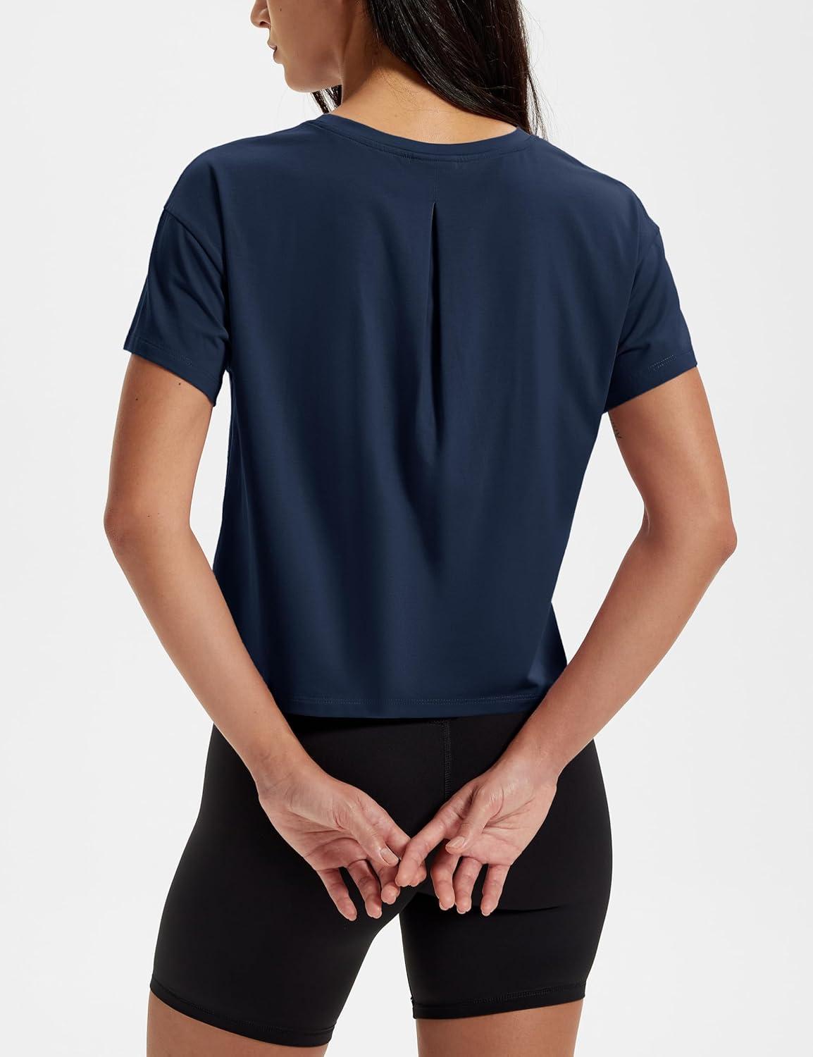MAGCOMSEN Workout Crop Tops for Women Short Sleeve Cotton Athletic Yoga Tops Loose Casual Cropped T Shirts(Navy)
